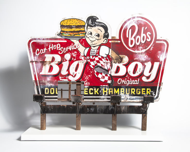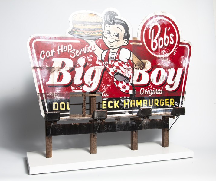 In the 1950s, Bob's Big Boy, a popular restaurant chain, featured billboards showcasing its iconic mascot, the "Big Boy" character. These billboards, often found along highways, depicted the Big Boy character holding a large hamburger. The design and style of the billboards were characteristic of the Googie architecture and roadside culture of the era.