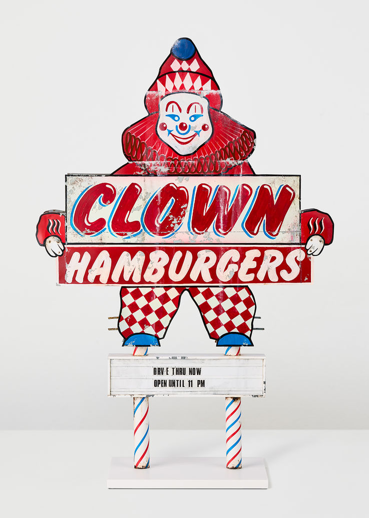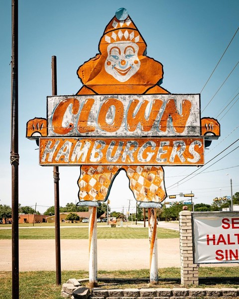 Clown Hamburgers is located in Haltom City, Texas, just east of Fort Worth. It came into existence in 1959, but closed in 1995 due to flooding. The restaurant has since reopened and been fully restored to its original format, making it a 'retro' diner, complete with the original sign, which is short in stature.