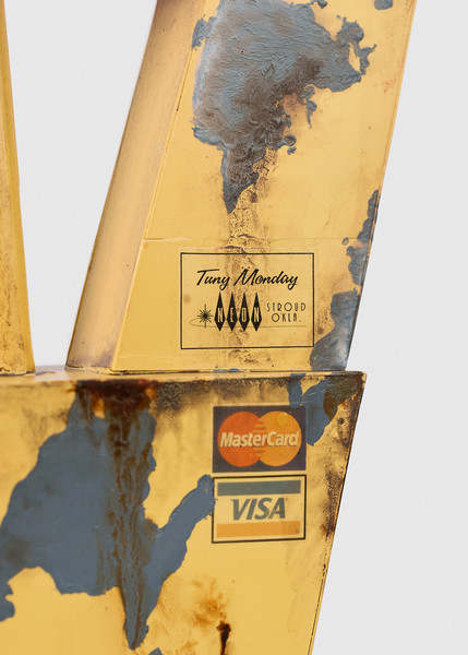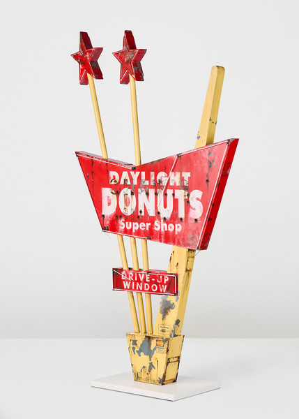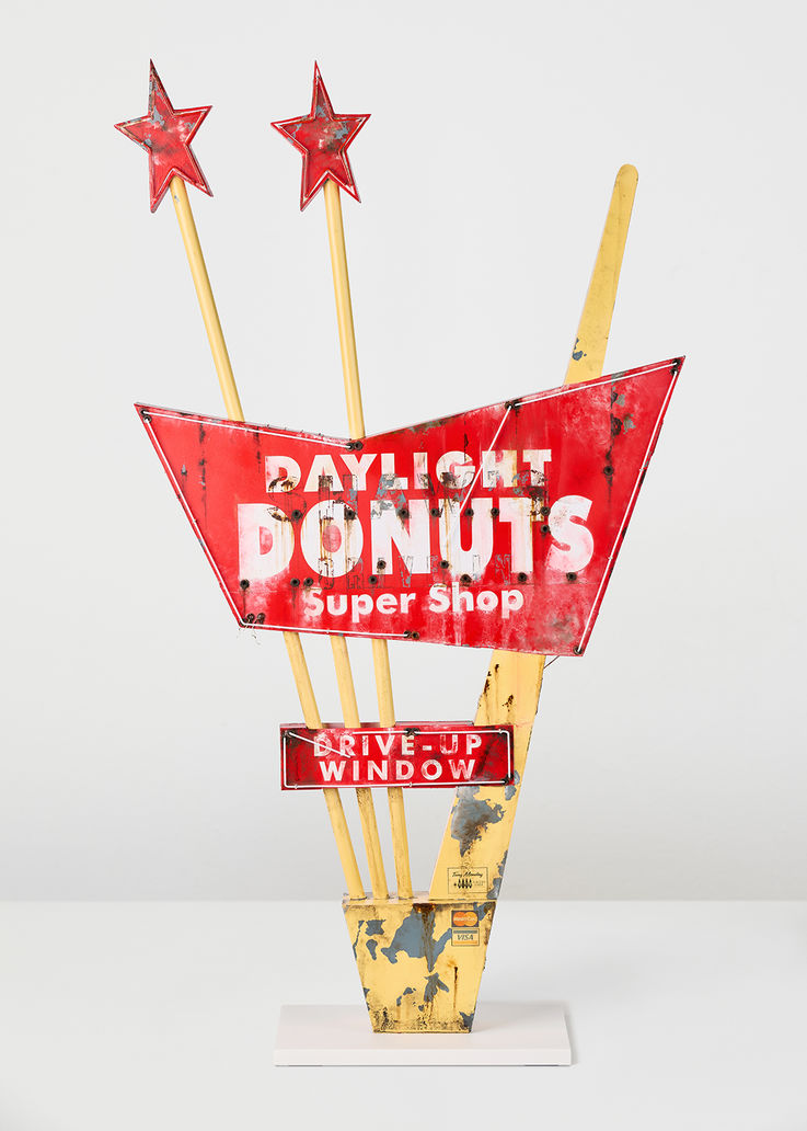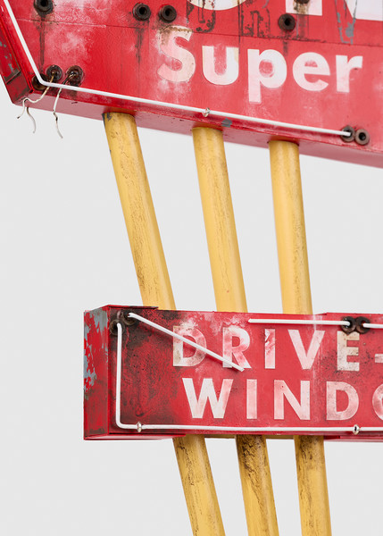 "When I was here at this Daylight Donuts in 2006, I chatted with the owner about this sign. I was told that the landlord was going to tear it down and build a new sign for this and the other stores on the property. Only a matter of months. I made a panic-ed call to Tod at the American Sign Museum. He couldn’t take it at the time. I’ve been relieved to see other people’s Flickr photos of it many times since then. I asked about it today and was told it’s protected now by the historical society in town. The owner wants to restore it but it’s $20,000. She’s thinking about doing a fundraiser — I urged her to contact me for help and suggestions about that. I worry that this one’s just going to collapse from rust one day like so many others do. There used to be a third pole with a star on top — but the city cut it off for power lines"