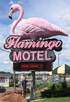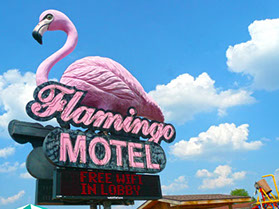 Flamingo Motel & Suites traces its roots to the mid-century glory days of family road trips in great big American automobiles. Vacationing families stayed overnight in one of those new-fangled 'motels'. They parked their cars conveniently near their rooms, and watched Route 66 on the pay-television: Just put a quarter in the slot for the next 30 minutes! And who can forget 'Magic Fingers?'