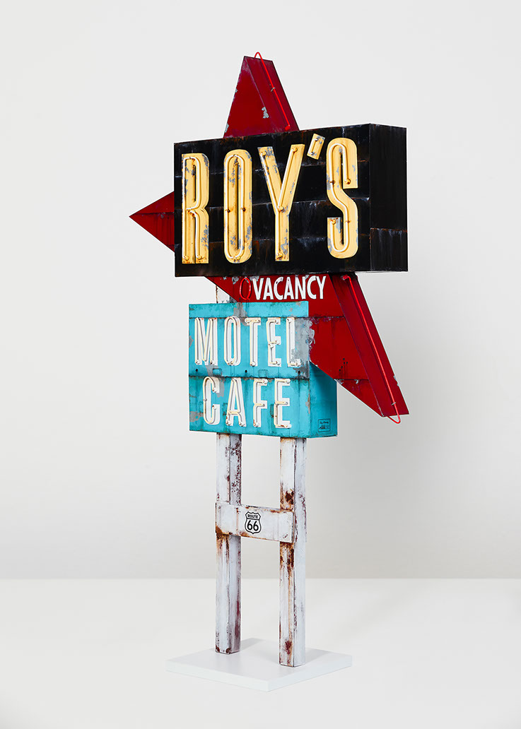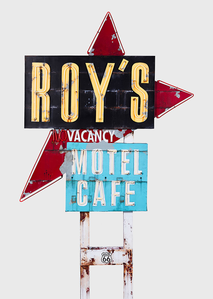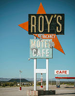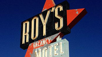 The Roy's Motel sign is iconic, and has now been restored. The business is the only one in rural Amboy, on the National Trails Highway Route 66. It is neighboured by a small runway and a volcanic crater.